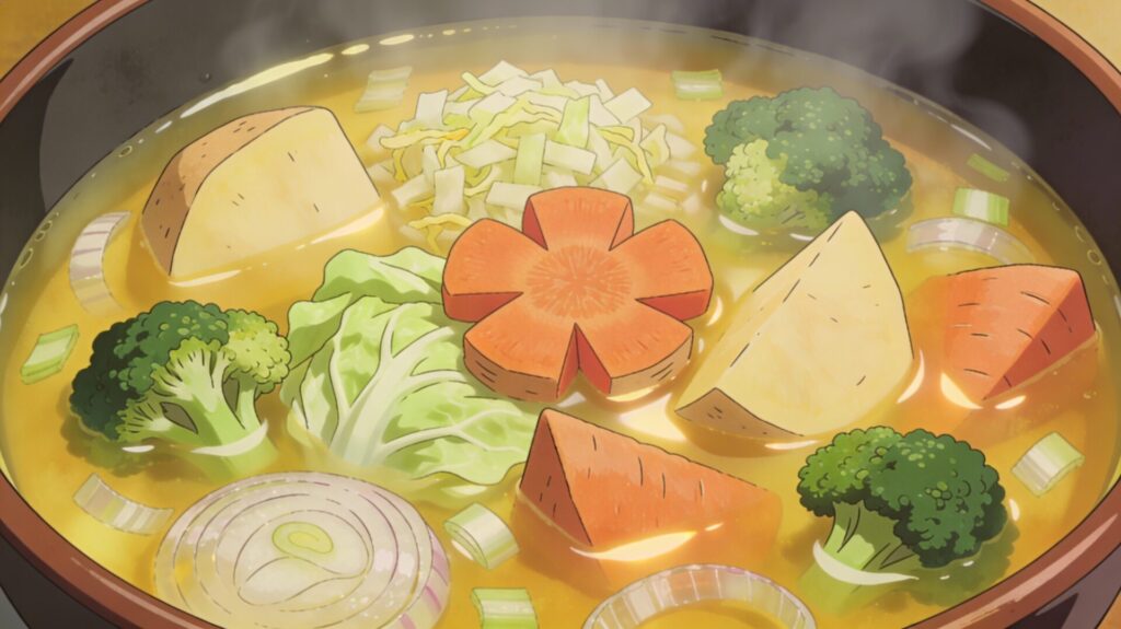- 野菜を切って鍋に入れ、水とぺぷちっこを加えて煮るだけ。最後に塩少々で味を整えると、体にやさしい具だくさんスープになります。